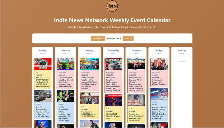 Check out an interactive version of this calendar here: https://indienewsnetwork-weeklycalendar.my.canva.site/live-calendar (**for some weird reason, the clicked links to youtube doesn’t work, but copying the link and pasting in a browser does work. Everything else works great!)