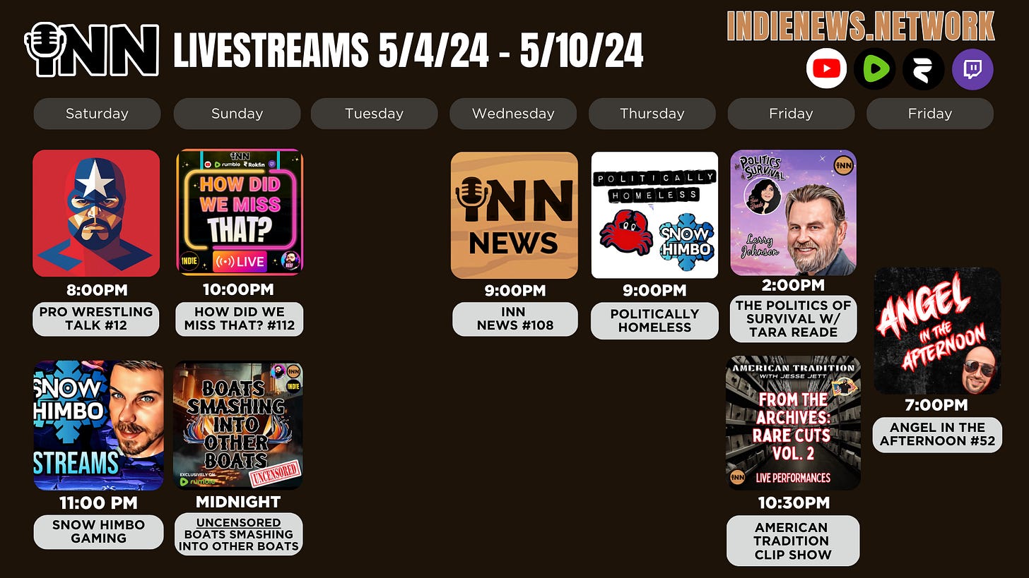 INN This Week 5/4 thru 5/10/24 | @GetIndieNews @jesse_jett @IndLeftNews @AngelJRivera08 @ReadeAlexandra @SarcasmStardust @BigMadCrab @SnowHimbo @ReefBreland @ogbonna_collin